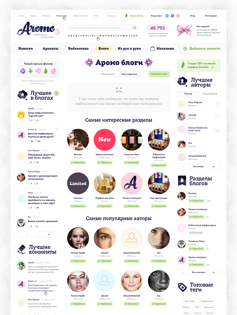 New Aromo is the most perfect and most functional perfumery project in Russian. Its database contains more than 50,000 fragrances that can be assessed by a variety of characteristics. New Aromo gives you an opportunity to stay up-to-date with current events in the world of perfumes, read editorials, keep a blog, exchange or sell flavors and to do a bottle split.
